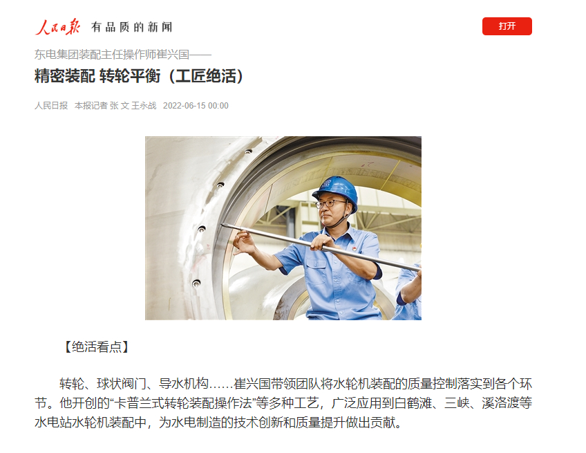 追求产品品质与效率,崔兴国还开创了“卡普兰式转轮装配操作法”等多种工艺,广泛应用到白鹤滩、三峡、溪洛渡等特大型水电站水轮机装配中,为水电制造的技术创新和质量提升做出贡献。“只有通过技能水平的提高制造出更高质量的产品,才能为社会创造价值。”在崔兴国看来,从事制造业就意味着要不断提升技能水平,追求更高的标准。