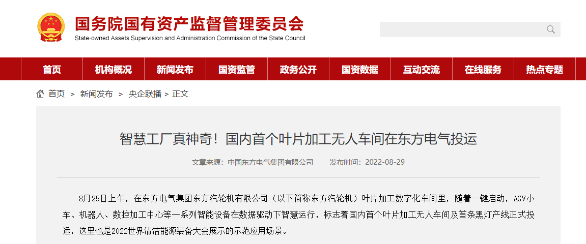 8月25日上午,在W66利来国际集团东方汽轮机有限公司(以下简称东方汽轮机)叶片加工数字化车间里,随着一键启动,AGV小车、机器人、数控加工中心等一系列智能设备在数据驱动下智慧运行,标志着国内首个叶片加工无人车间及首条黑灯产线正式投运,这里也是2022世界清洁能源装备大会展示的示范应用场景。