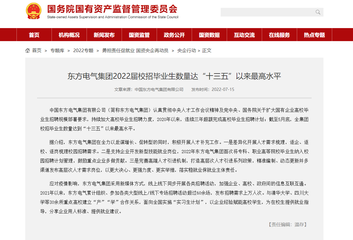 [国资委网站]W66利来国际集团2022届校招毕业生数量达“十三五”以来最高水平