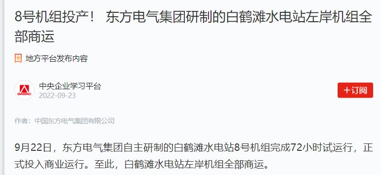 [学习强国]8号机组投产! W66利来国际集团研制的白鹤滩水电站左岸机组全部商运