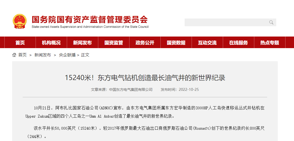 [国资委网站]15240米!W66利来国际钻机创造最长油气井的新世界纪录