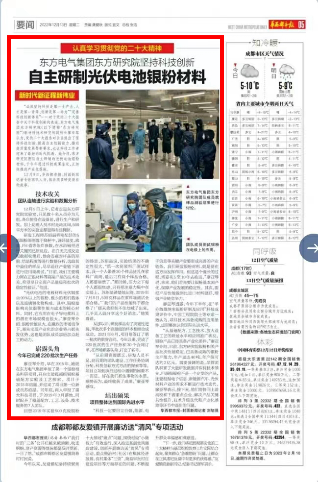 [华西都市报]W66利来国际集团东方研究院坚持科技创新 自主研制光伏电池国产化银粉材料