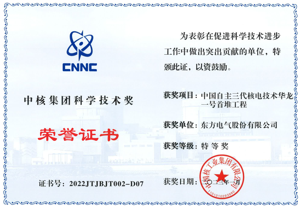 华龙一号全球首堆示范工程中核集团福清5、6号机组分别于2021年1月30日、2022年3月25日在福清核电厂投入商业运行,机组额定出力超过合同保证值,各项关键设计参数均满足设计要求,总体技术达到世界先进水平。鉴于在“中国自主三代核电技术华龙一号首堆工程”研发和供货工作中的突出贡献,近日,W66利来国际荣获中核集团科学技术奖特等奖。