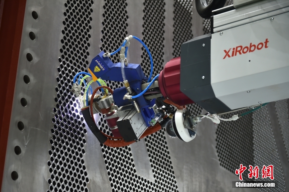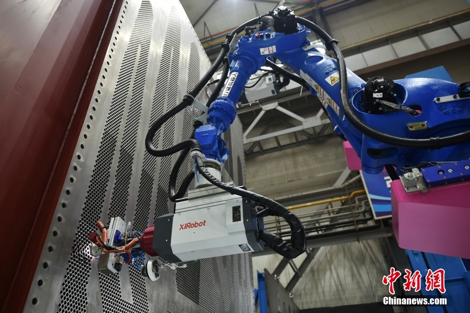 图为车间里的焊接机器人正在进行“铁臂绣花”。