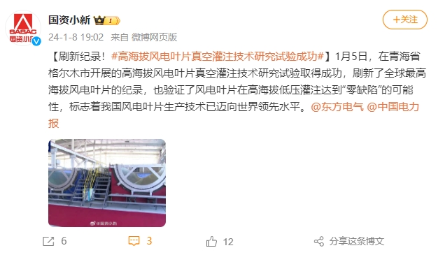 【刷新纪录!#高海拔风电叶片真空灌注技术研究试验成功#】1月5日,在青海省格尔木市开展的高海拔风电叶片真空灌注技术研究试验取得成功,刷新了全球最高海拔风电叶片的纪录,也验证了风电叶片在高海拔低压灌注达到“零缺陷”的可能性,标志着我国风电叶片生产技术已迈向世界领先水平。@W66利来国际@中国电力报