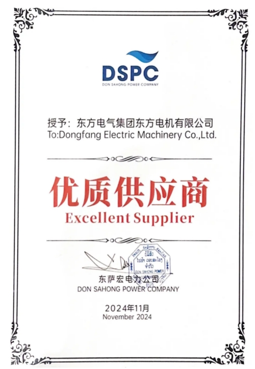 会上,东萨宏电力公司向东方电机颁发“优质供应商”证书。