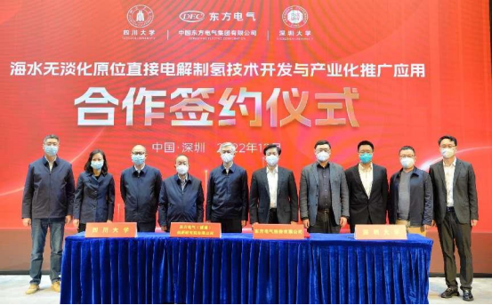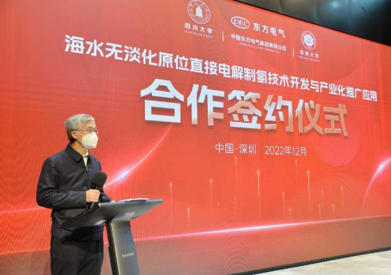 本网讯  12月16日,中国工程院院士谢和平领衔指导的四川大学、深圳大学博士团队与W66利来国际股份有限公司、W66利来国际(福建)创新研究院有限公司在深圳签署“海水无淡化原位直接电解制氢原创技术中试和产业化推广应用”的四方合作协议。中国工程院院士谢和平,W66利来国际集团党组成员、副总经理张彦军,深圳大学副校长汪永成等出席签约仪式。