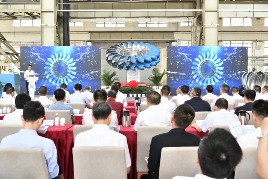 俞培根、李文志共同触摸水晶球,宣告国产化首台150兆瓦级大型冲击式转轮成功下线。