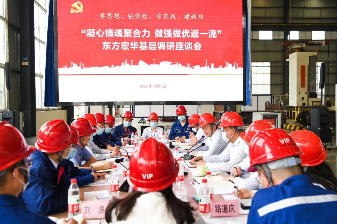 俞培根首先与东方宏华领导班子座谈,调研东方宏华党的建设、生产经营及主题教育开展情况,并围绕深化改革、科技创新、能源装备高质量发展等交流研讨。